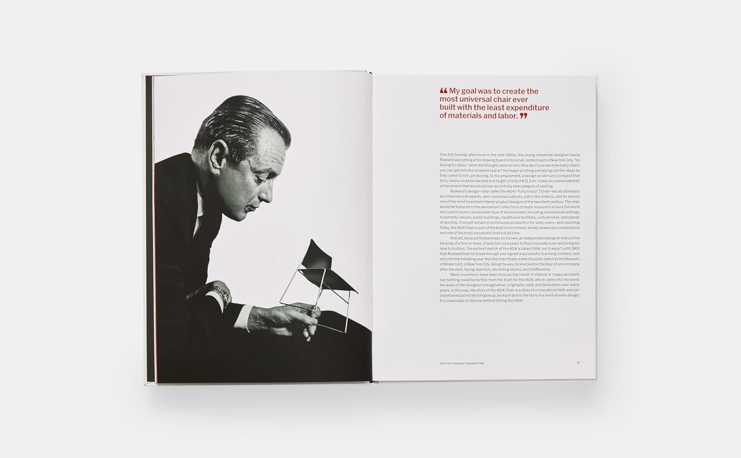 Rowland’s wife Erwin and writer Laura Schenone reveal the inspiring story of how he brought his ground-breaking design to market. Initially, it was rejected by all the major furniture brands, including Herman Miller and Knoll, but Rowland persevered, and ultimately, the 40/4 chair became one of the most successful chairs ever produced, winning numerous accolades and selling over 8 million by the early 21st century. Today it is found in the permanent collections of museums worldwide, and gracing public and private spaces of every type – from cathedrals to cultural centres, corporate and municipal buildings, to places of worship, schools, healthcare, hospitality and homes.