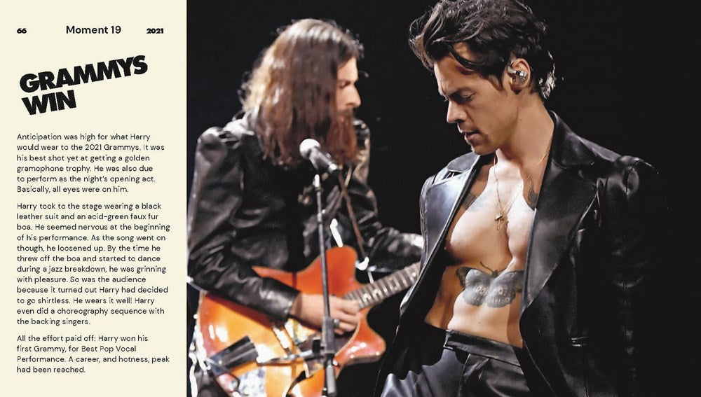 Harry Styles has earned many accolades and this book will explore 30 of his biggest highlights to date, including his hat trick at the Grammys, performing with Stevie Nicks at the Rock and Roll Hall of Fame Induction Ceremony and his sold-out Love on Tour.