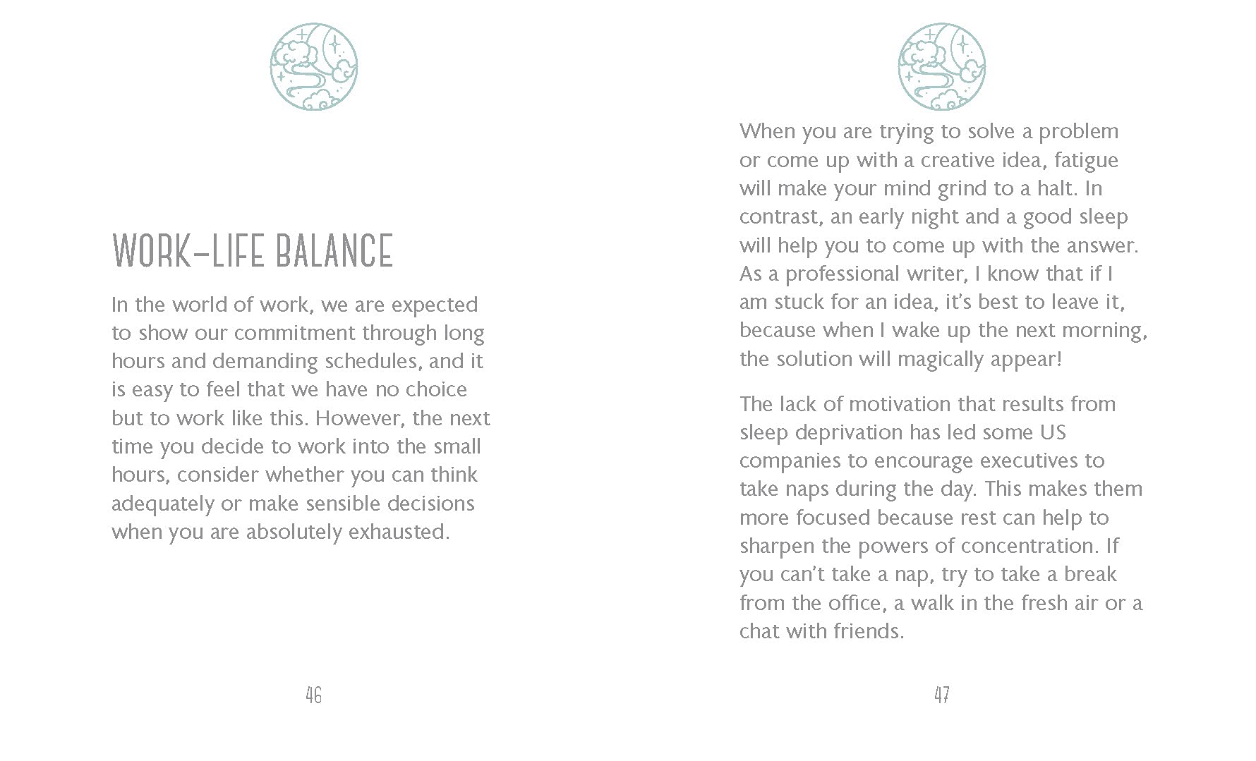 The Little Book of Sleep has all the information you need to enhance your life with a good night’s sleep.How much sleep is normal? What might be preventing you from sleeping well? This trusty tome deals with both of these questions and more. The Little Book of Sleep shows which foods are over-stimulating and which are calming, looks at dreams and what they mean, provides advice on surviving long plane journeys and avoiding the dreaded jetlag, and ends with a few sleepy myths that will have you nodding off in no time.Top Tips to Ease the StressThere are some ways to make shift work more bearable.1. When you are working, make sure the light is bright, and when you are meant to be sleeping, make sure the room is dark.2. Don’t wait until the night you start your shift to change sleeping patterns. Try to go to bed a little later each night in order to anticipate the change it will make to your wake-sleep patterns.3. Eat proper meals and don’t resort to convenience food and alcohol to help you wind down. You will cope better if you eat nourishing food.