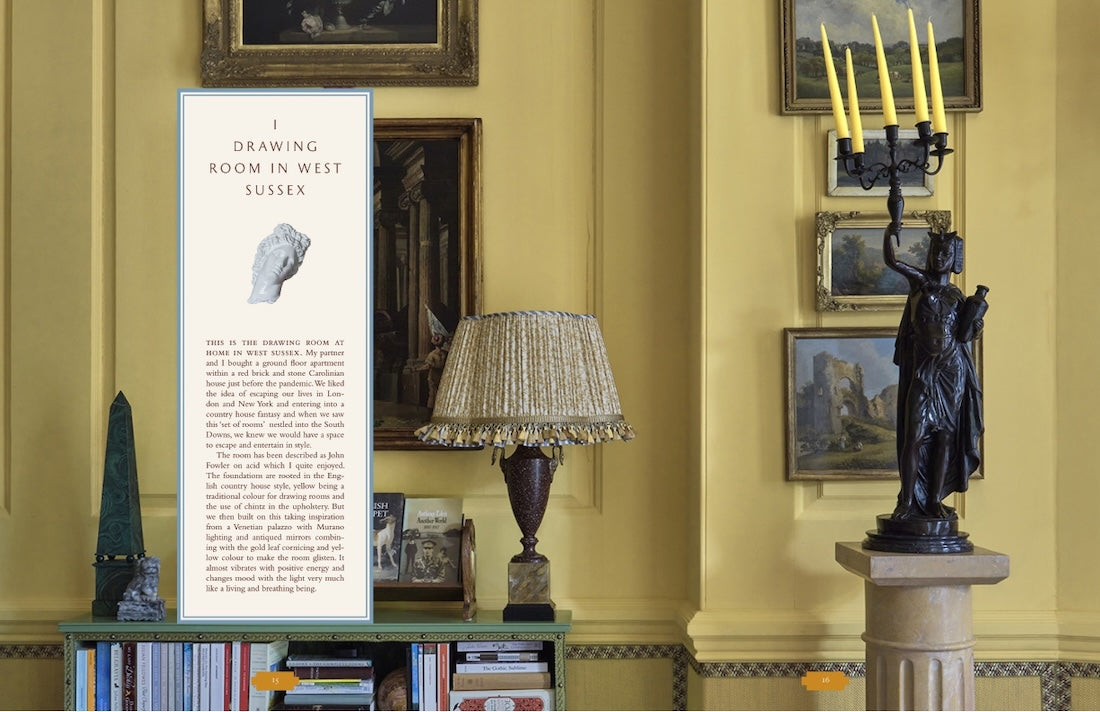 In this enchanting volume, the designer draws inspiration from nature, art, fashion, and history to show us how color influences his life and work. The charming design of the book brings the magic of his world to life: classical busts are unmoored from their pedestals, silky peonies embellish texts, candelabras glow, and birds flutter free from their frescoes and travel with us for pages. Each chapter is devoted to a single color, illuminating how Brudnizki leverages the emotional power of color to enhance the overwhelmingly beautiful and luxurious spaces he creates.